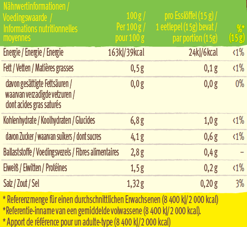 Sauce douce aux tomates, poivrons et oignons à servir en dip ou pour parfaire l’assaisonnement des plats (bocal de 312 g).